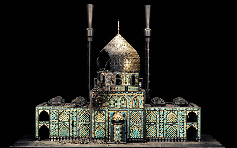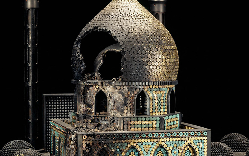 Al Farrow's meticulously crafted sculptures—currently on view in Divine Ammunition—are both haunting and mesmerizing. Using materials such as deconstructed guns, bullets, bone, glass, and steel, Farrow creates ornate religious structures, ritual objects, and reliquaries that are visually striking and emotionally confounding. Through these shockingly beautiful and highly detailed sculptures of churches, synagogues, mosques, mausoleums, Jewish ritual objects, and Christian "casket" reliquaries, all rendered from munitions, Farrow examines the abiding relationships between religion and violence, peace and brutality, the sacred and the unholy.