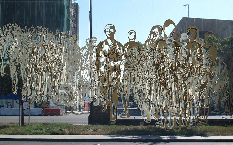 Amy Oates is fascinated by the way individuals interact in negotiations between public and personal space. Oates finds that our cities—those static dots on the map—are formed, altered, and sustained by anonymous persons, fleeting moments, rubbed shoulders, blocked views, stuffy spaces, converging paths, diverging destinations, what is given, and what is taken. Her work explores the “crowd” as a singular unit, representative of ephemeral moments captured in time where individuals come together to create something new, abstract, and larger than themselves. To create her work, Oates spends a lot of time in crowds. In her daily encounters traveling in and commuting around cities, she observes the way people interact and use space. She sketches and takes photographs for source materials looking for individuals with interesting movements or shapes. After drawing, she cuts out the negative space with an X-Acto knife. Installations are made up of several layers of paper that Oates arranges into a composition and strings together so they can hang freely. After growing up on a tiny island outside of a big city in Florida, Amy Oates slowly made her way west, first studying art at Baylor University, then cutting her chops in Seattle’s art scene, and currently residing and creating in Oakland, California. She has participated in gallery exhibitions and temporary public commissions in Washington, California, and Texas; curated multidisciplinary arts events; and invested into youth development through afterschool arts programs. Oates’ work explores negotiated processes of growth, change, and movement in both social and natural phenomena, in subjects ranging from urban crowds to coral reefs. She primarily works in painting, printmaking, and cut paper installation, and finds that investing into communities through the arts is an integral part of her artistic practice