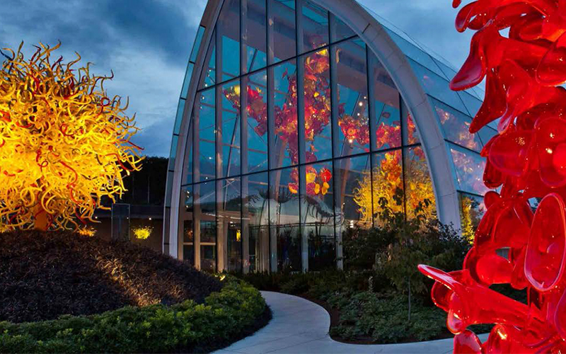 Join us for an exclusive guided tour of Chihuly Garden and Glass! See the Garden and Glass at night for a different experience. Chihuly Garden and Glass provides a look at the inspiration and influences that inform the career of artist Dale Chihuly. The artworks demonstrate how he pushed the boundaries of glass as an art medium in concept, execution, and presentation.