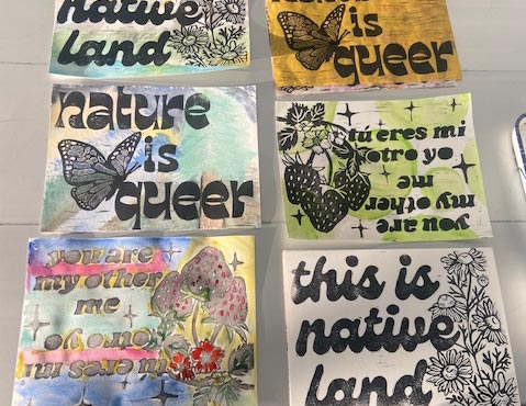 Visitors of all ages are invited to decorate linocut prints with artist Eileen Jimenez. Participants will make prints using blocks designed by Eileen, featuring images of LGBTQIA+ community pride and of the natural environment. Watercolors and brushes will be made available for visitors to make each print their own unique vision.